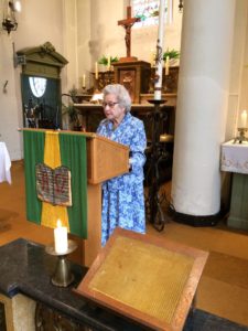 Jenny van Rossen, lectrice in Overschie, heeft afgelopen zondag 17 juni voor het laatst gelezen in een zondagsviering. Jenny, op een respectabele leeftijd van 96 jaar, nam het besluit om als lectrice te stoppen omdat de voorbereiding van de viering haar inmiddels te veel energie kost. Helemaal afscheid neemt ze echter niet: ze heeft aangegeven nog wel te willen blijven lezen in de viering van vrijdagmorgen in de kerk van O.L.V. Altijddurende Bijstand, wanneer zij deze viering bijwoont.