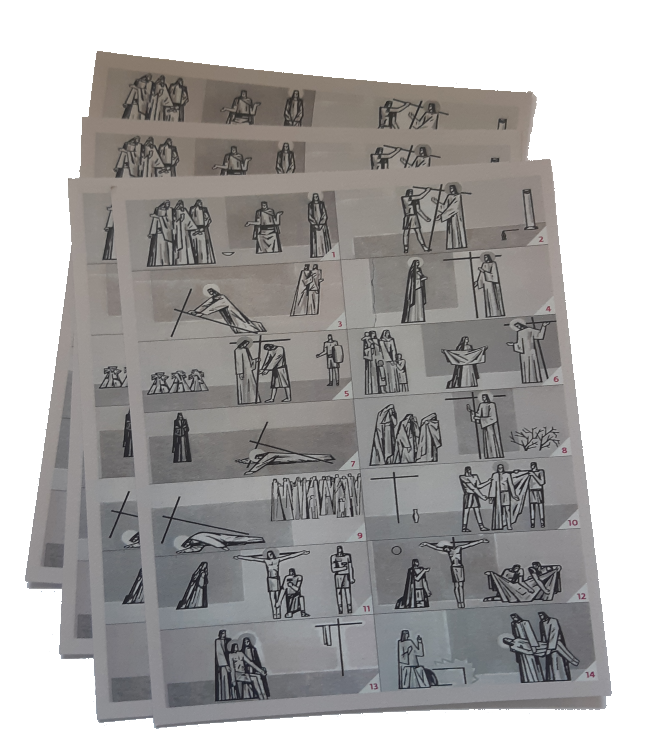 Ter gelegenheid van de Goede Week heeft het bisdom Rotterdam speciale kaarten laten maken waarop de 14 staties staan weergegeven. Afgebeeld zijn de staties uit de Rotterdamse Liduinakerk die voor velen van ons erg vertrouwd zijn. En een van de staties is ook afgebeeld op het spandoek in de tuin van de pastorie.