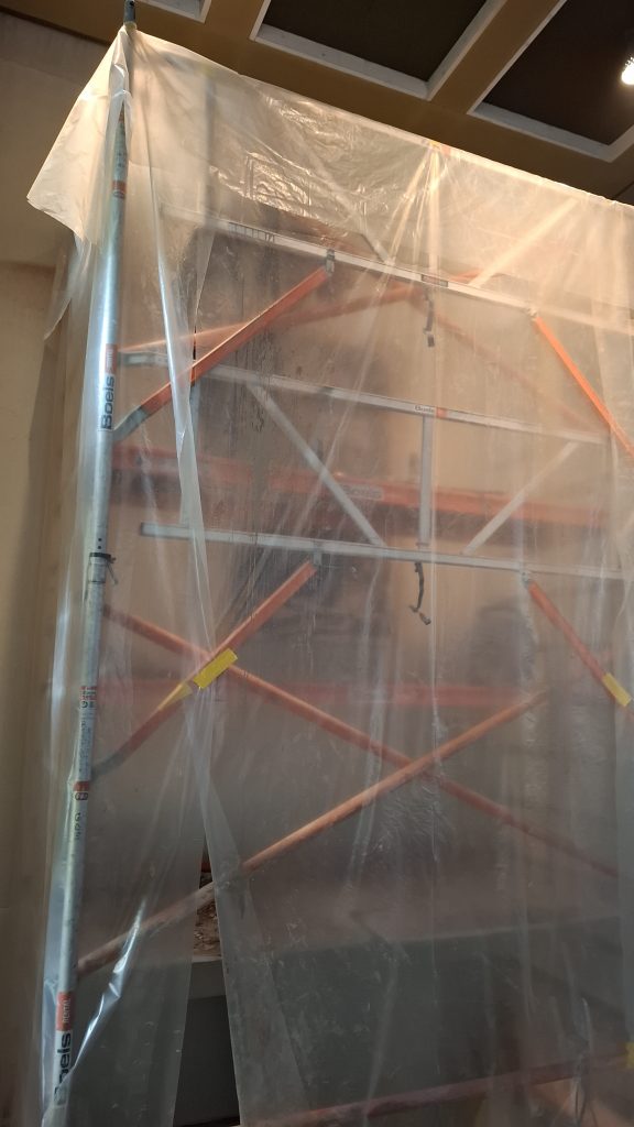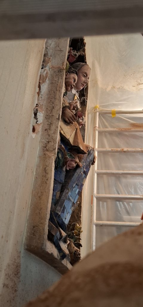 De werkzaamheden om het kunstwerk uit de muur van de Liduinakerk te halen zijn vandaag gestart. Maria zit vaster in de muur dan verwacht, daarom duurt het tot na het weekend voordat de werkzaamheden zullen zijn afgerond. Dat betekent dat bij de viering van zondag het Maria-altaar is afgeschermd.