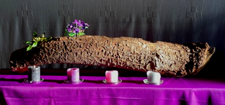 Op de tweede zondag van de Advent kunnen we zien dat we onderweg zijn naar het licht van Kerstmis. Vandaag wordt niet alleen de zwarte maar ook de lichtere paarse kaars aangestoken. En in de stam bloeien nu paarse bloemen: er gloort al licht in de duisternis!